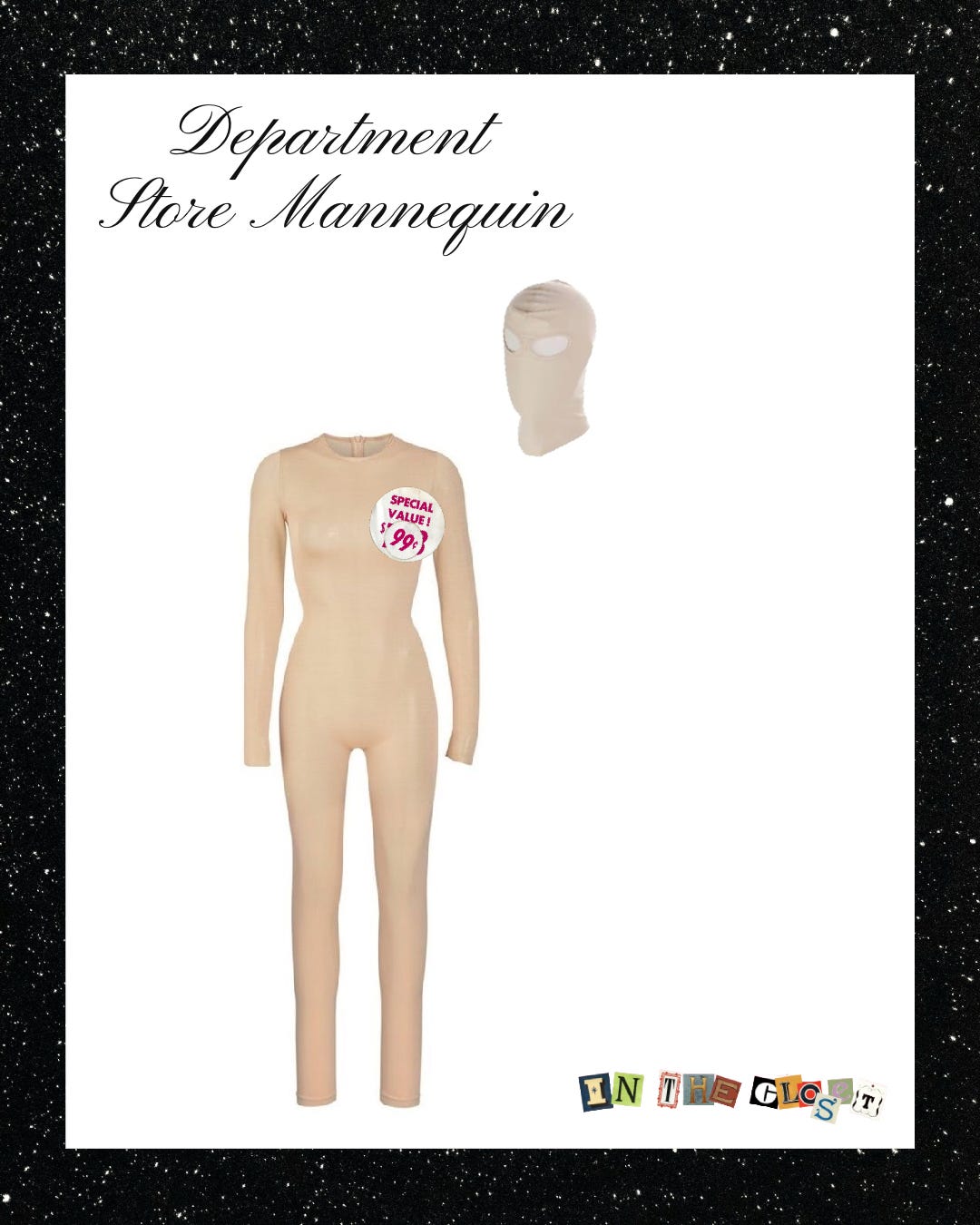 Glossy neutral outfit (or nude latex suit if you’re bold). Add a “SALE” sign and strike your best frozen pose. It’s performance art.