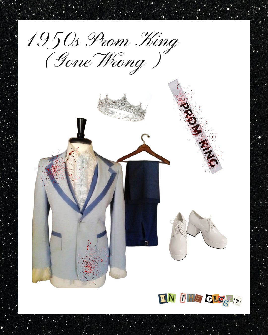 Powder-blue tux, red glitter “blood,” and a crooked crown. Think Carrie — tragic, glamorous, and totally dramatic.