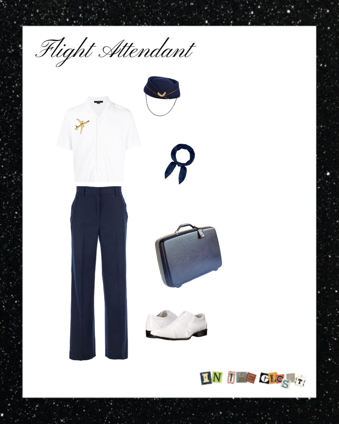 Vintage Pan Am fantasy: crisp uniform, scarf tied tight, structured hat, and a matching carry-on. Mile-high chic.
