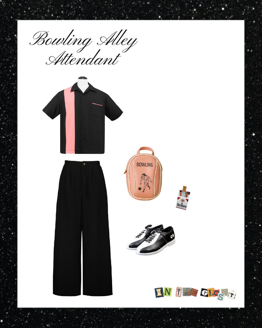 Color-blocked shirt, embroidered name patch, wide slacks, vintage bowling bag. Add a cigarette behind the ear for flair.