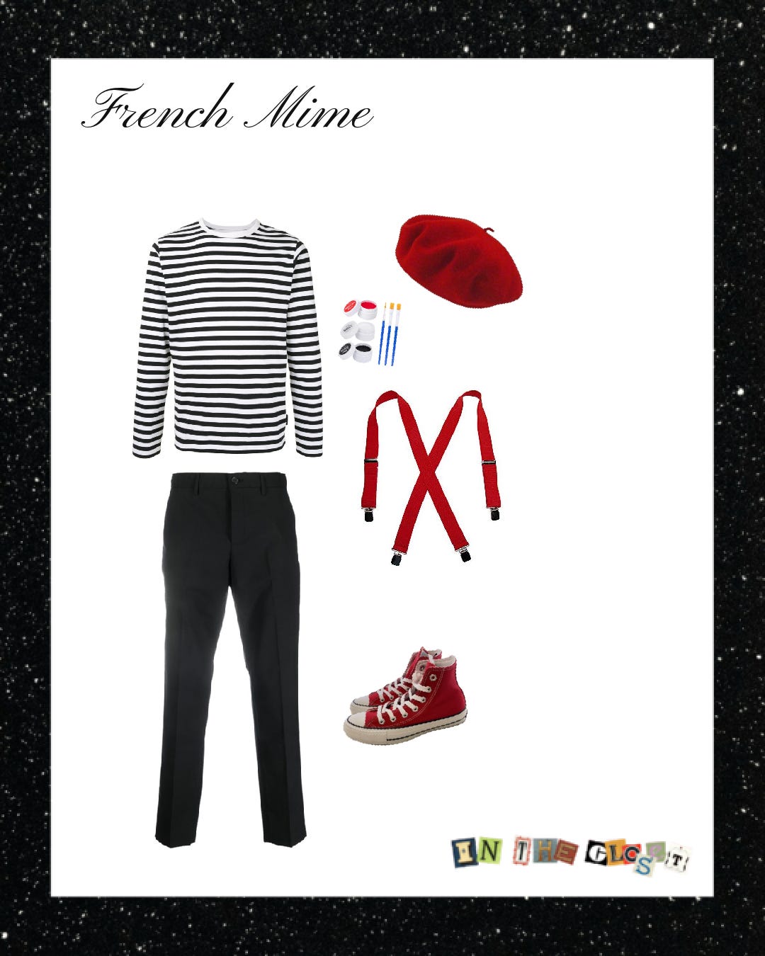 Striped shirt, red suspenders, beret, gloves, white face paint. Simple, dramatic, and works solo or in a group.