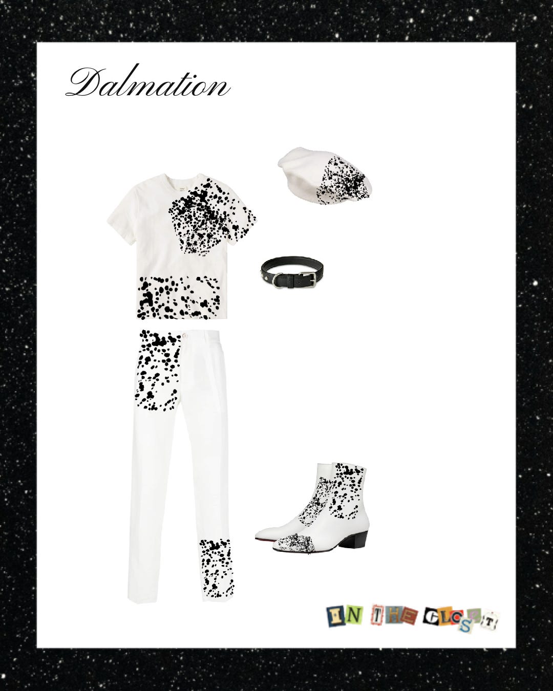 All-white outfit covered in black spots — hat, top, boots, all of it. Add a dog collar if you’re feeling frisky. Cute and instantly recognizable.