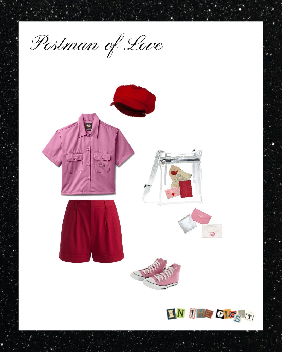 Baby pink shirt, bright red shorts, postman’s hat, and a mailbag full of shimmery “love letters.” Keep it innocent — or not.