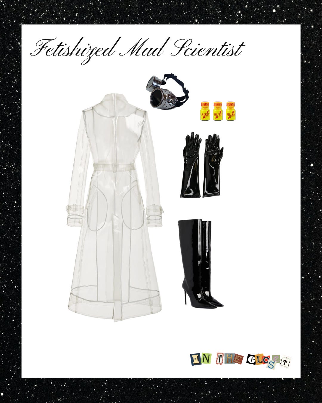 White latex coat, rubber gloves, tall leather boots, slicked hair. Add retro goggles and a mysterious serum — equal parts sexy and scary.
