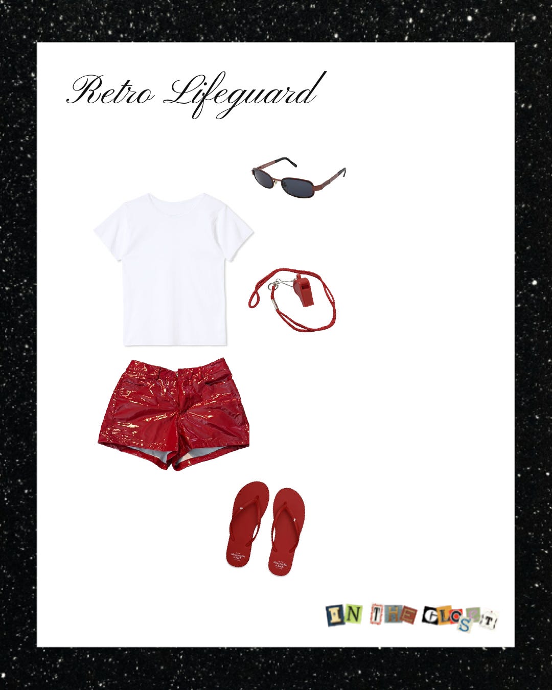 Red vinyl shorts, whistle, slicked-back hair for a wet look, and maybe a streak of sunscreen on the nose. Baywatch meets Fire Island — you’re on duty.