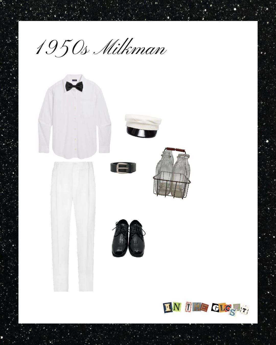 Crisp white button-down, white pants, black belt, milkman’s cap, and a little black bowtie. Carry a vintage milk bottle carrier for the full fantasy. Very wholesome.