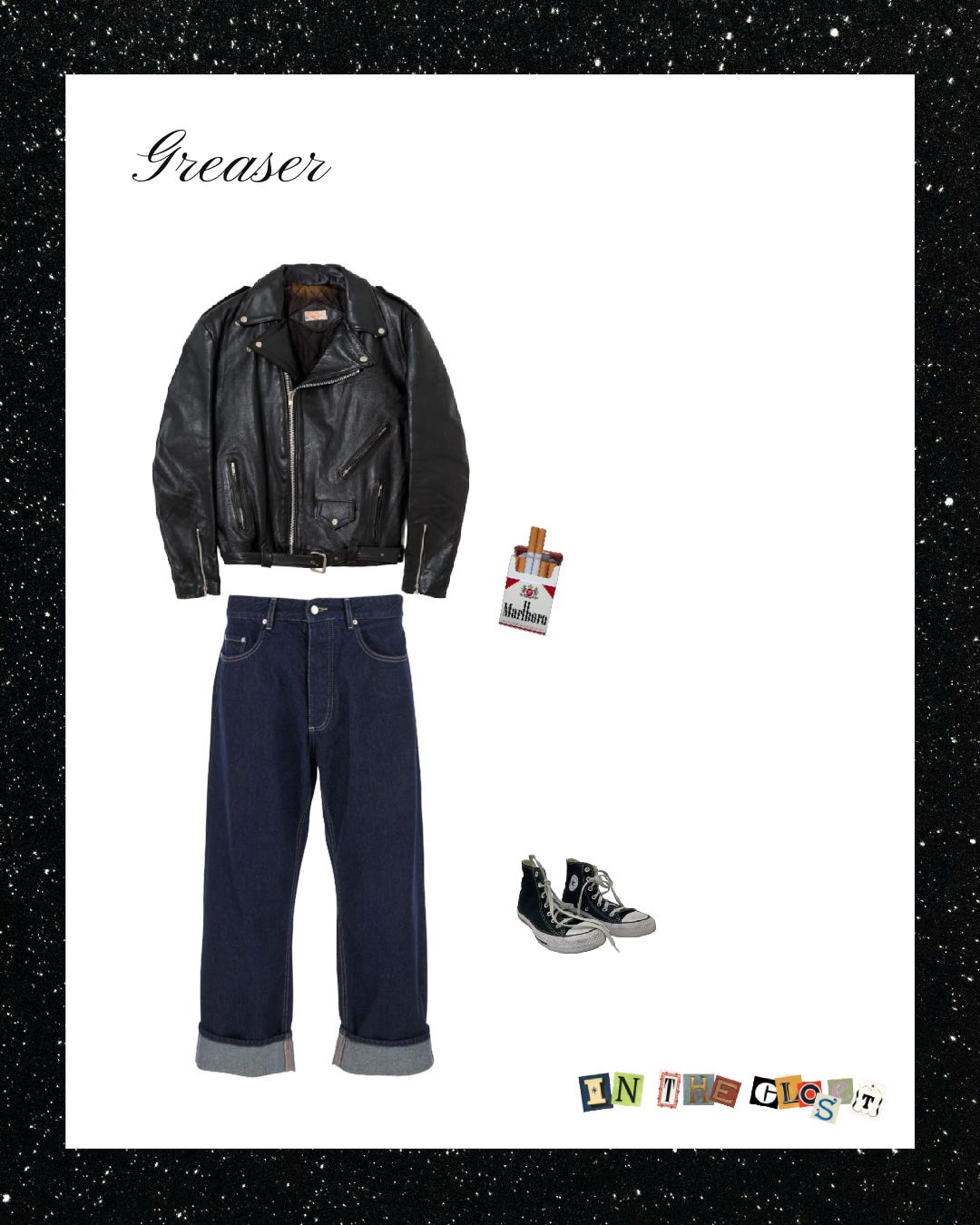 Cuffed jeans, a leather jacket, and a pompadour if you’re going all in. Bonus points for a cigarette. Rebel without a cause…or shirt.