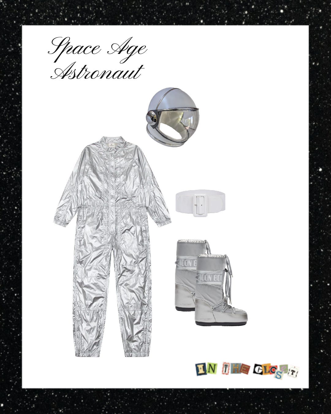 1960s sci-fi inspired jumpsuit, helmet, and fun shoes; Moon Boots if you got ‘em. Very Jetsons-coded.