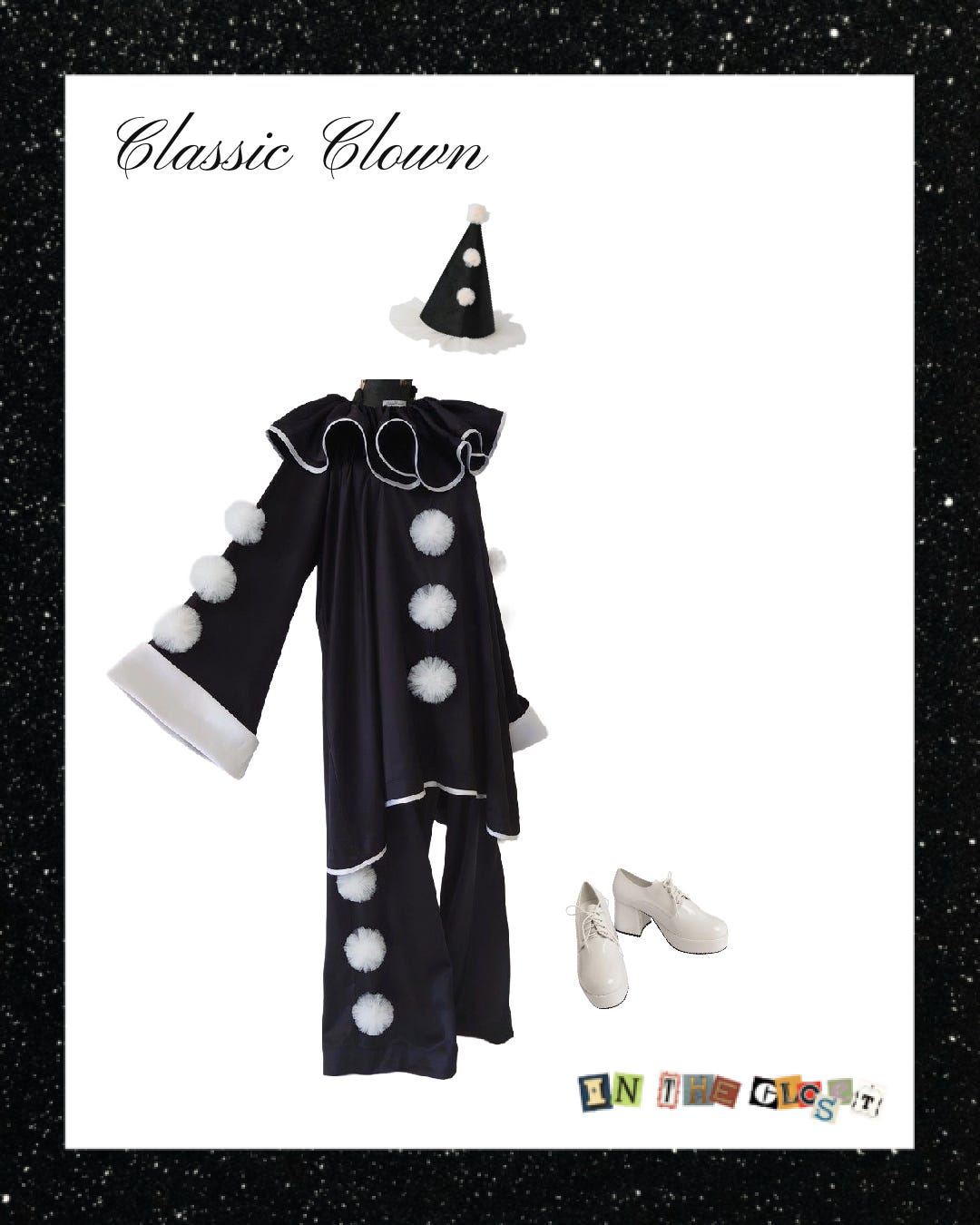Ruffled collar, cone hat, and an old-school clown suit. Add a red nose if you’re feeling goofy, or keep it dark and draggy for something more Cabaret-coded.