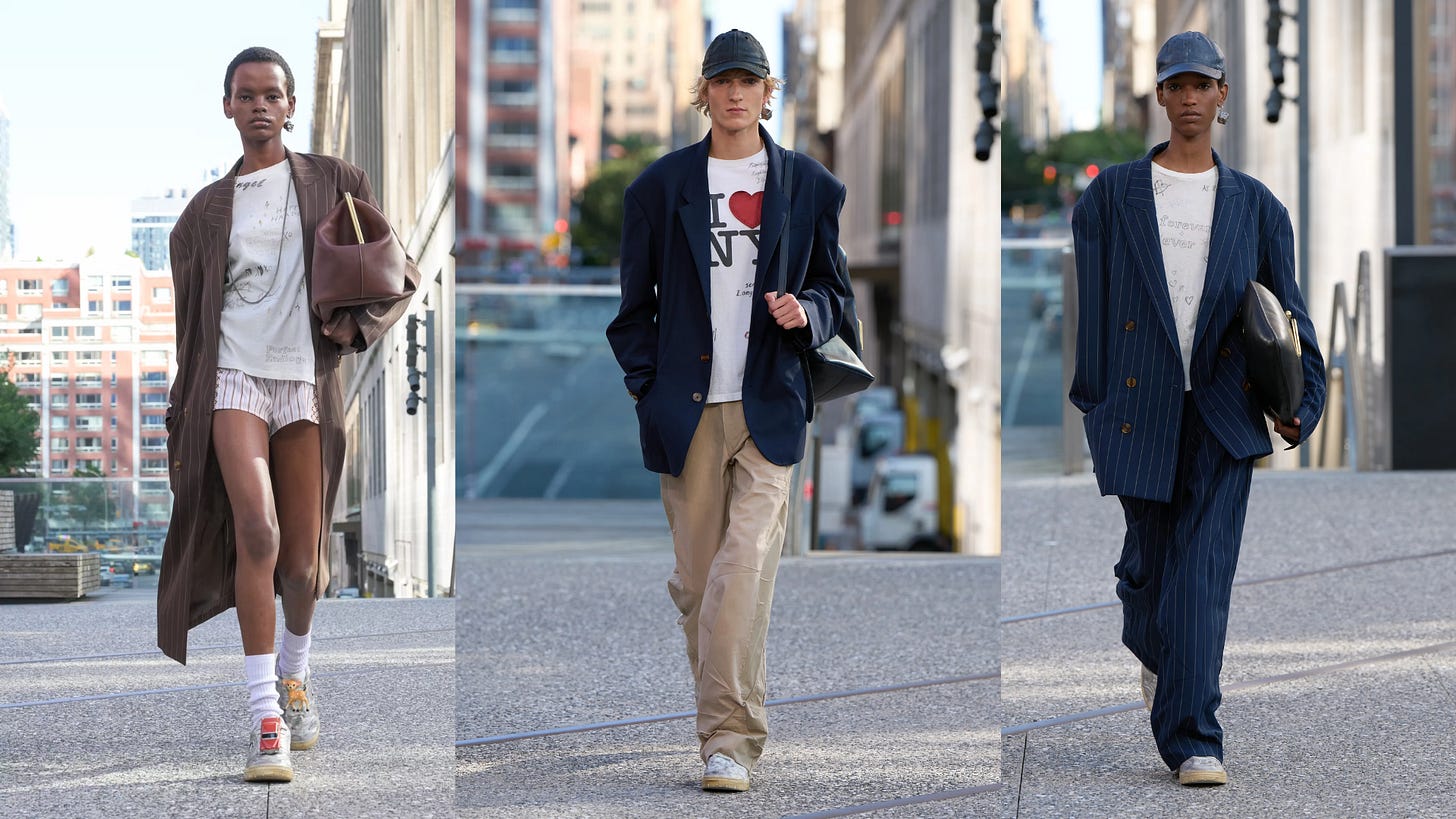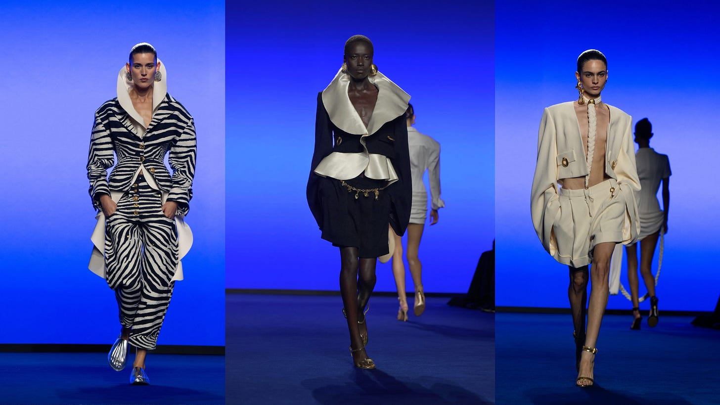 Spring/Summer 2025 has brought out the ’80s-inspired power tailoring yet again: at Saint Laurent, Anthony Vaccarello shows oversized leather jackets and full-length coats with sharply defined shoulders; Daniel Roseberry’s Schiaparelli blazers combine structured padding with smooth, architectural lines; and Stuart Vevers at Coach offers streamlined power suiting in inclusive sizes, featuring clean cuts in rich tweeds and suedes.