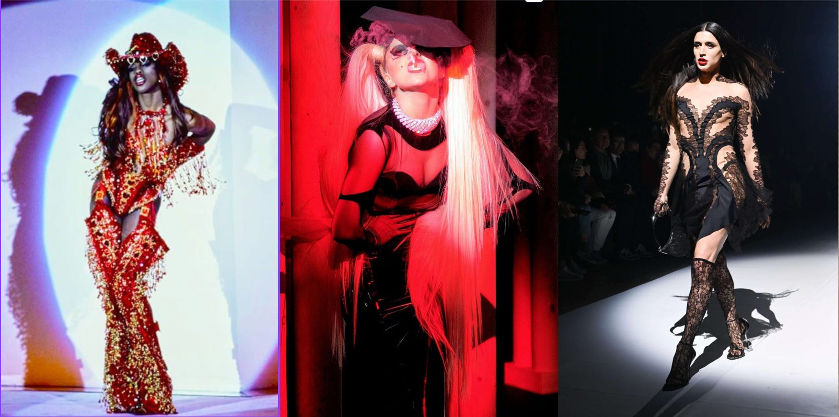 At the height of the AIDS crisis, under an openly gay designer, the brand didn’t shrink itself — it amplified queerness on its runways. Mugler was one of the first major designers to cast drag queens, trans women, porn stars, and other “non-traditional” models, creating some of the most unforgettable moments in fashion history. Think Lypsinka’s strip-tease and Connie Fleming as the bejeweled red cowgirl in SS92. Lady Gaga’s cigarette-smoking “Government Hooker” in FW2011. Arca snatching a bag from the audience in FW2023. All legendary. All incredibly gay.