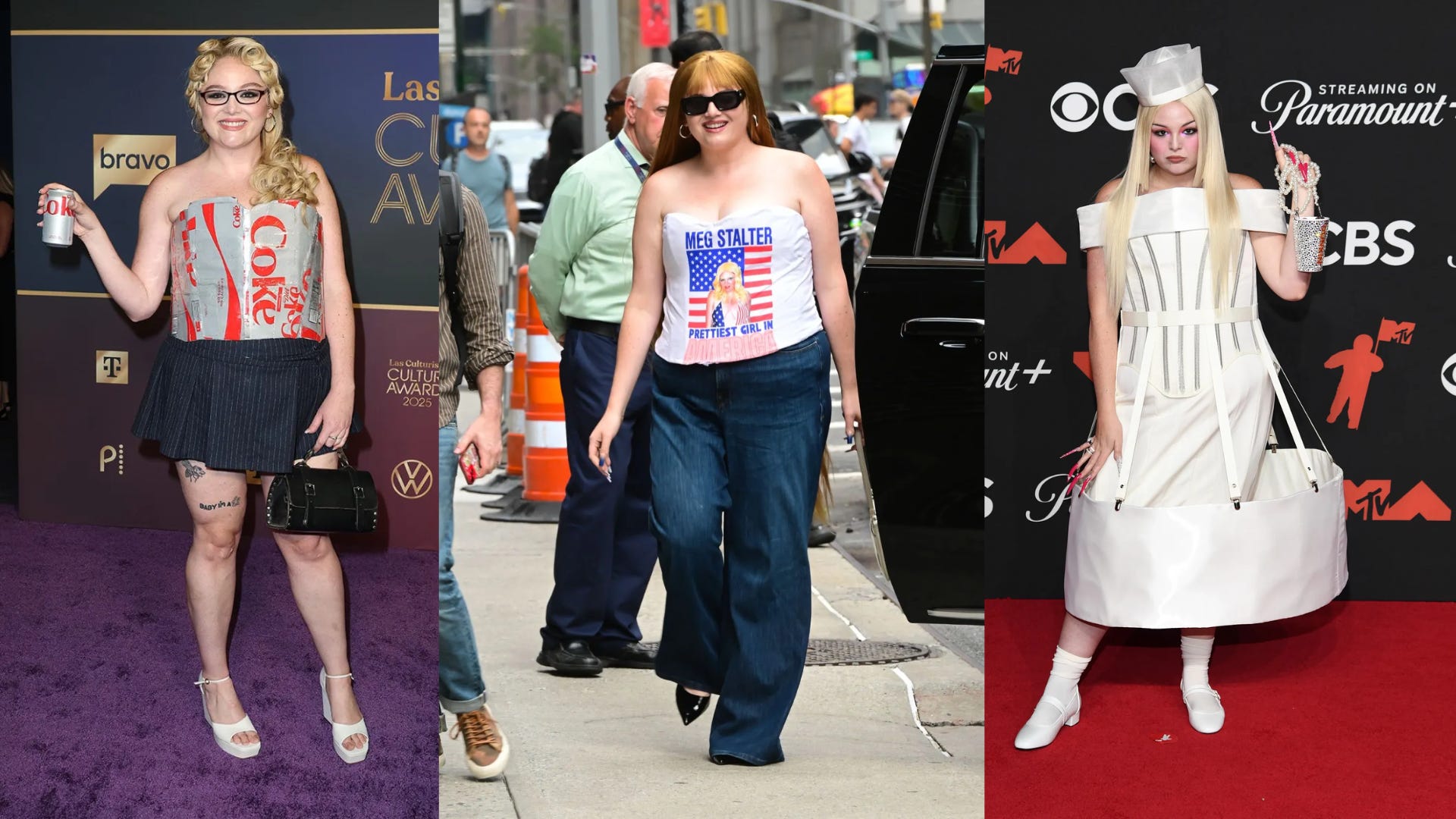 Meg Stalter, styled by Kat Typaldos, blurred fashion and performance art. Diet Coke box-tops. Bedazzled Dunkin’ cups. Corsets printed with her own face. Camp with confidence — no irony required.
