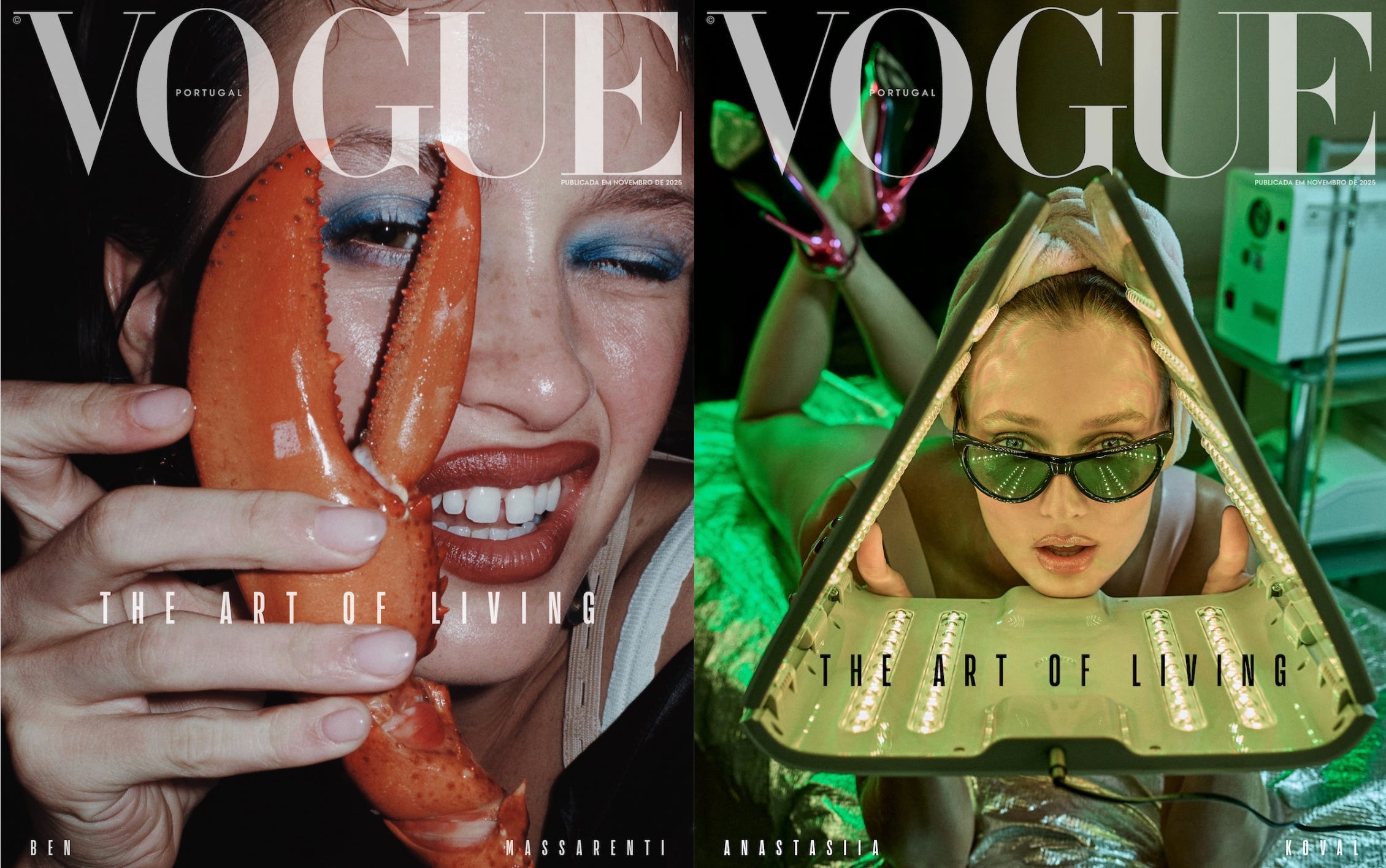 The November issue of Vogue Portugal gave us three covers that didn’t play it safe. Two by Sam Spence (including the lobster-claw, blue-eyeshadow moment) and one tanning-booth fever dream by Jamie Nelson. Glossy, weird, and perfect.