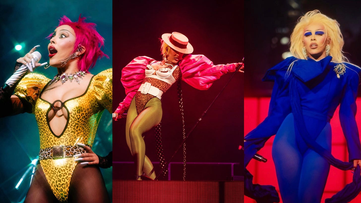 On the Tour Ma Vie World Tour, Doja Cat and stylist Brett Alan Nelson delivered ’80s power dressing, lingerie-office siren hybrids, body-horror references, and Blitz Kids energy — all with full commitment. Fashion as character, not costume.