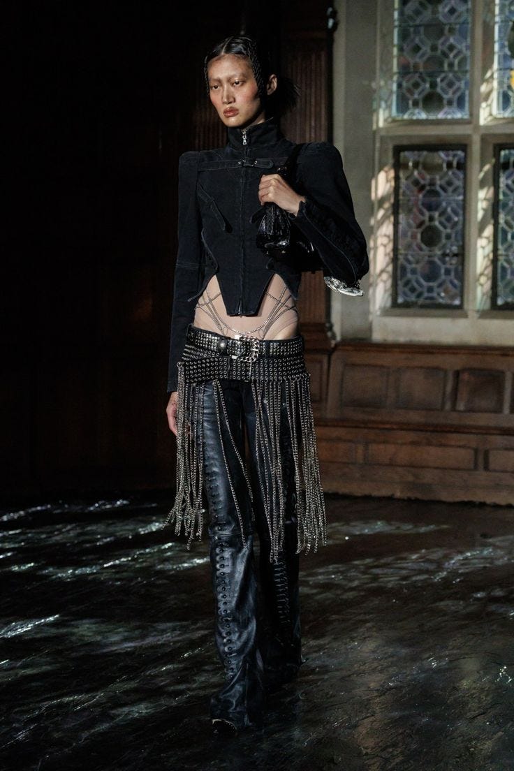 But punk was never just a sound. It was an attitude. That yearning for originality? You can see echoes of it in every hyperpop girlies rave look. The over-the-top digital personas and chaotic maximalism — they feel like the modern version of punk’s anti-fashion ethos. Bladee wandering around Sweden in outfits that look like he crawled out of a glitchcore dumpster is honestly the internet-era equivalent of some 1970s kid shredding their jeans on purpose. And Dilara Findikoglu’s distressed, fetish-filled collections? Think Vivienne Westwood and Malcom McLaren’s SEX. Different mediums, same sentiment.