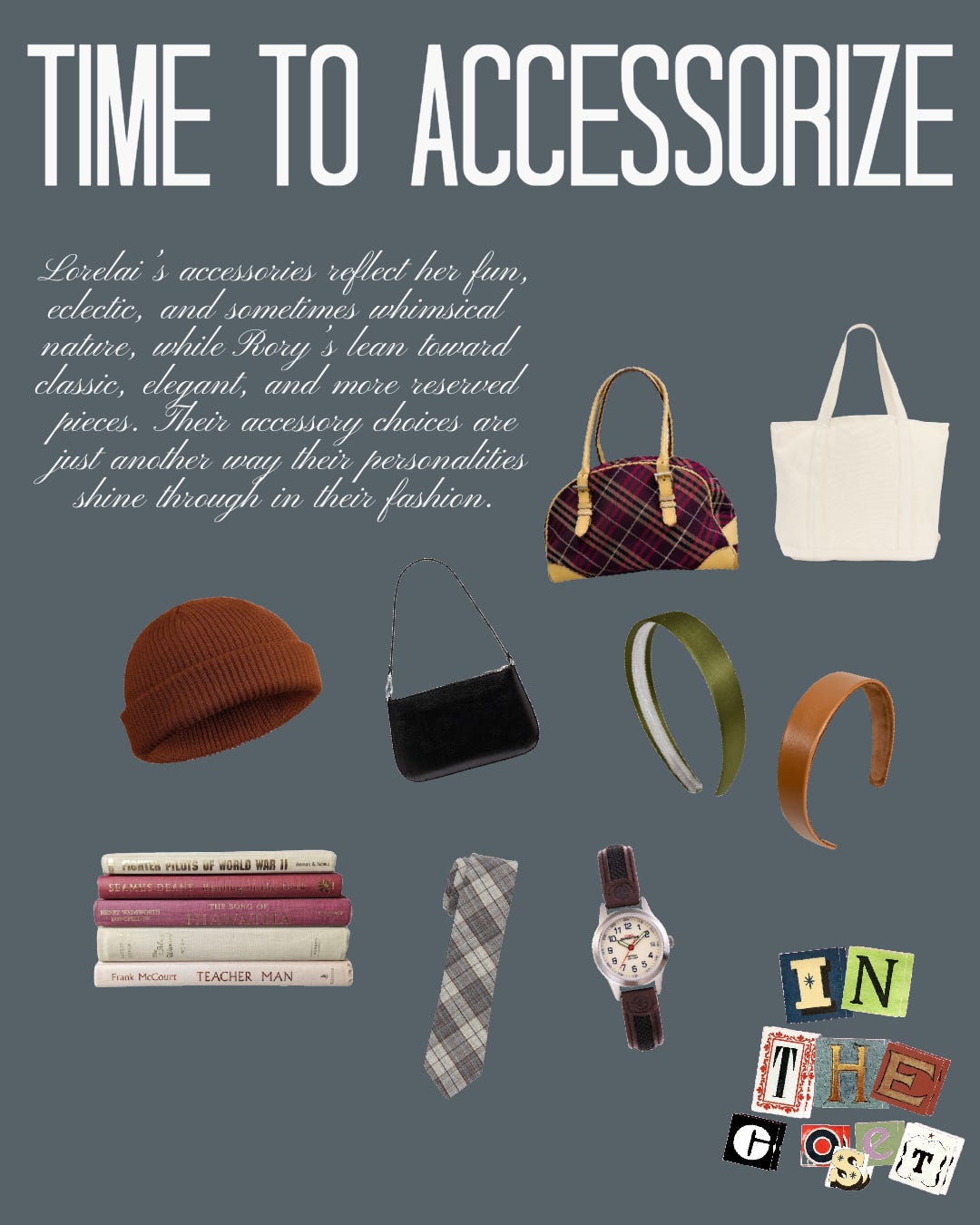 It’s all in the details—wide-brimmed hats, hair ribbons, and small brown sunglasses add an extra layer of style to any look. When it comes to bags, Lorelai leans toward chic shoulder bags, while messenger bags and slouchy totes are perfect for Rory’s scholarly vibe.