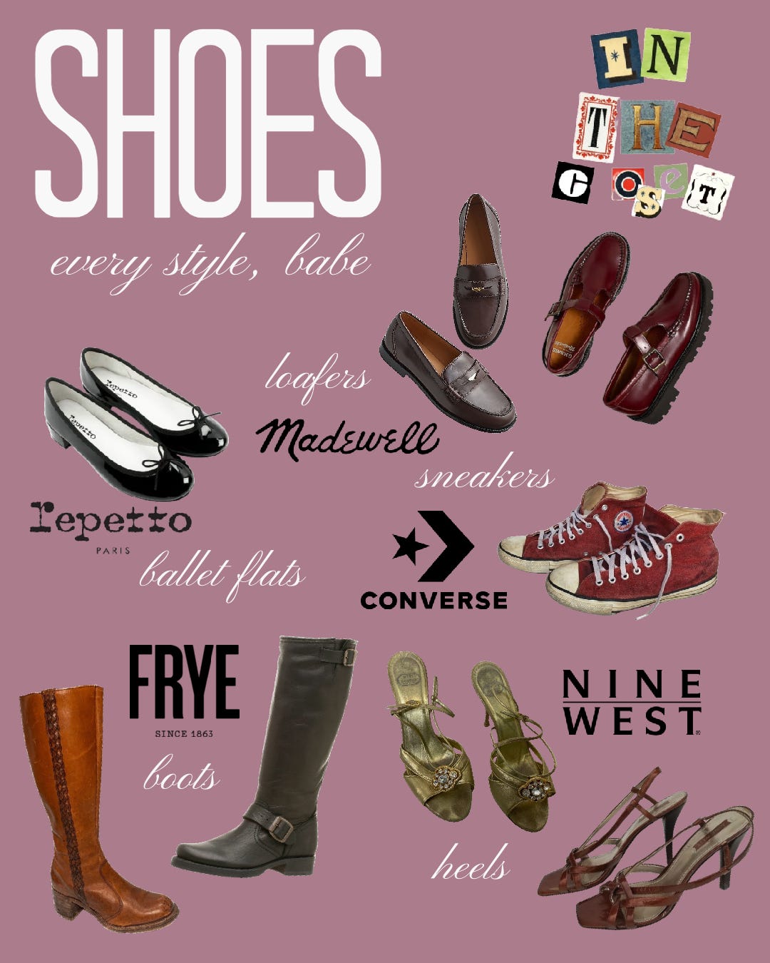 Chances are you’ll be walking around Stars Hollow this fall and winter, so practical yet stylish footwear is key. Ankle or knee-high boots in neutral tones like brown, black, or beige are versatile essentials for any Gilmore Girls wardrobe. Ballet flats and loafers add a polished touch, while Converse sneakers are perfect for everyday wear. And of course, no Gilmore-inspired outfit is complete without a pair of classic kitten heels—vintage Nine West pairs are my personal favorite.