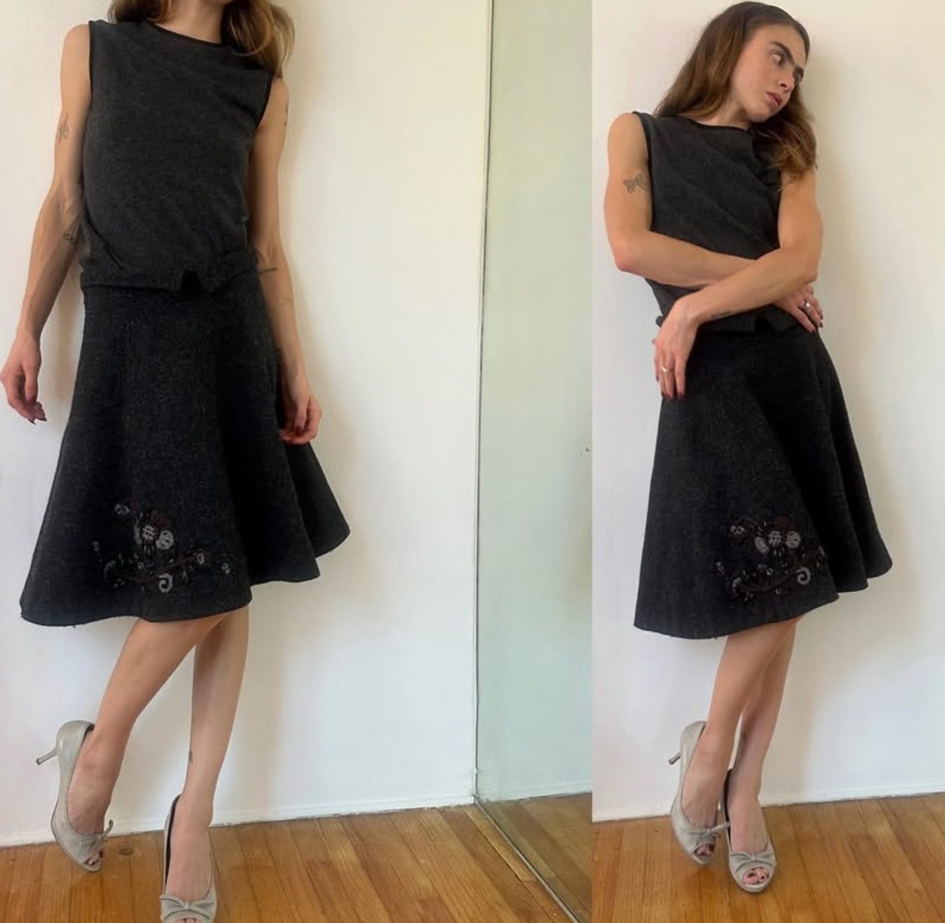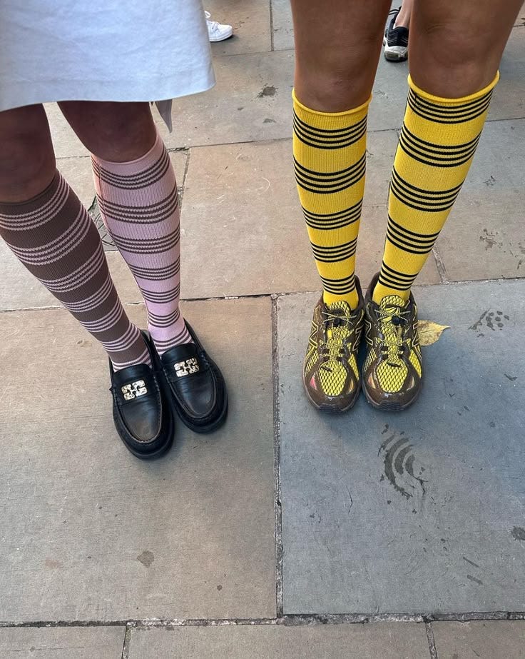 Along with polka dots, stripes are going to have a serious moment. With the rise of clown core and a collective craving for whimsy, bold striped prints are the perfect way to incorporate fun into an outfit. I see this trend popping up a lot in tights—hopefully, we’ll be seeing more multi-colored combos like yellow and green or pink and purple. But stripes won’t just be about playful hues; with both 2010s Tumblr-chic and minimalist fashion gaining traction, the classic black and white striped long sleeve is bound to be the staple of the season. It’s just too perfect!