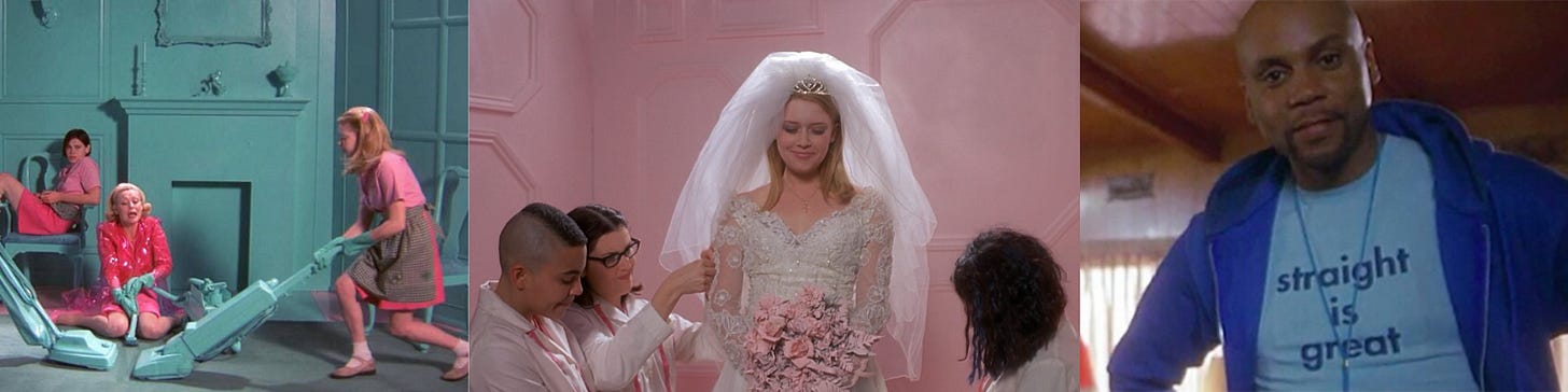 “If I were writing a paper about it, I’d say it’s feminization of the camp aesthetic—bringing emotion to something that’s hyper-realized,” said director Jamie Babbit. From a fashion standpoint, But I’m A Cheerleader taps into camp—a sensibility defined by exaggerated expression and irony. Queer communities have long embraced camp as a way to subvert societal expectations and celebrate individuality. Babbitt recognized, “The history of camp has pretty much been defined by gay men, so I wanted to be sure that the film, while using camp, also had real emotional moments, that it was a romance.”