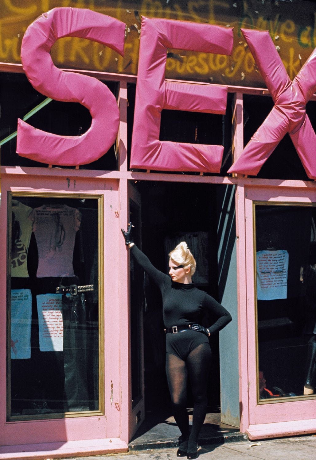 By 1974, Jordan started working at SEX, essentially becoming the face of the storefront and the living mannequin for Westwood and McLaren’s creative designs. She wasn’t the friendly “can I help you?” type. The idea of approaching her was intimidating; most people didn’t. They’d silently tiptoe up and set whatever they wanted on the counter, hoping that was enough.